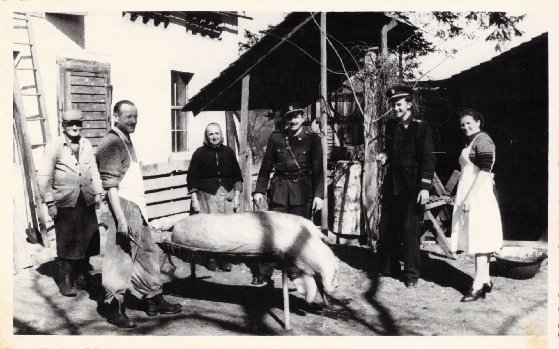 Firefighter School Mystery HPW, May 3, 2025May 8, 2025 Sorting letters and photos and found this postcard. It was unsent, but says “These are the houses where I live for 25 years. I live in the small one in the back.” My best guess is that someone from our family was a caretaker, staff and/or lived nearby. The school was only in existence for 13 years. A bit of research shows that from 1950 to 1963 it served as a firefighting training school. (Google Translated Link). It also seems the building is still in existence! Here’s the current street view: However, figuring out who wrote the letter is still up for some investigation. Upon learning it was a fire school, it reminded me of this photo that was in the family collection which appears to be taken in front of the same building, but the jury is still out on how these gentlemen are related. I believe I have another picture with firemen of a pig roast, though there are other non-firemen folks in the photo, which makes me think that the gentleman in the apron is our relation: And the final piece of the puzzle of who lived near the firefighter school is this photo that roughly says on the back “this is my husband, the butcher, two firefighters and the cook” taken March 12, 1954. Slovenian Roots MedvodeSloveniaUnknown